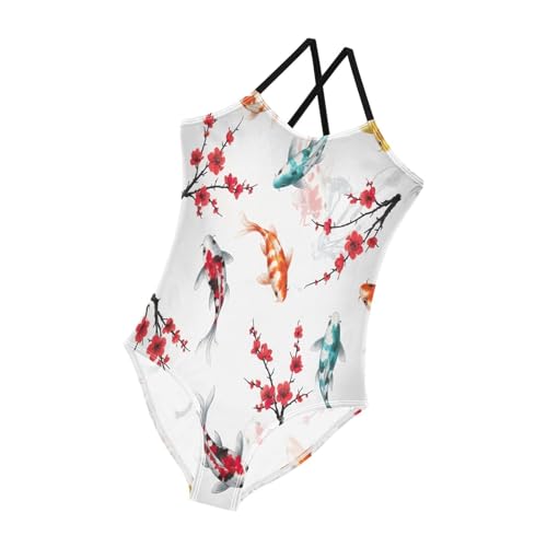 Colorful Koi Fish Red Flowers Girls Swimming Suit, Beach Swimsuit Girls 3-10 Y with Adjustable Shoulder Strap, 3-10 Y