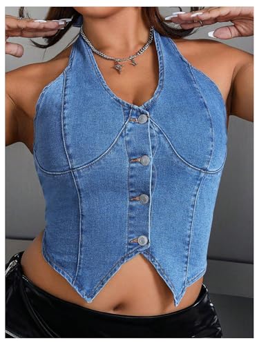 sizzling ! OYOANGLE Women's Plus Size Button Front Halter Denim Tops Y2K Open Back Crop Jean Vest