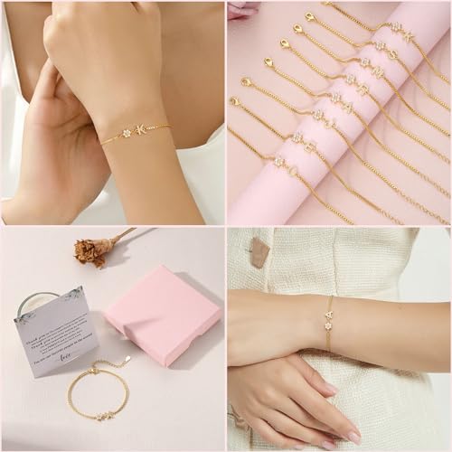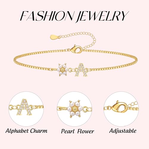 Bridesmaid Proposal Gifts Initial Bracelet for Women with Flower Pearl Bracelets for Teen Girl with Letter 14k Gold Plated Bracelet with Floral Adjustable Wedding Flower Girl Gift Junior Bridesmaid Bracelets Jewelry