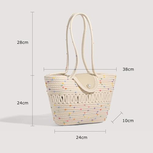• LARGE CAPACITY - The chic summer bag is a cute trapezoid. 38cm(upper)/24cm(base)/23cm(H)/10cm(W). A magnetic buckle for expedient access. The upgrade handle is convenient to rest it on your shoulder. A utility and fashionable accessories