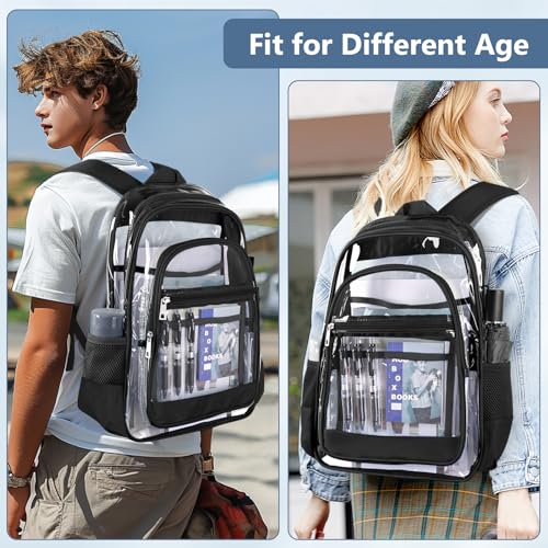 Great for Back to School: This clear bookbag is a perfect option for students who attend schools with strict security measures, transparent design allows quick and easy check of the contents. Great for seeing inside and quickly finding what you need, perfect present for new term of boys and girls. Recommend for over 6 years old.Large Size & Multi-pockets: 16.53*11.81*7.08in. Mieakvool clear backpack is designed with multi compartments, 1 large main double zippers compartment, 1 upper front pocket with 2 small inside pockets, 1 front compartments and 2 side mesh pouches. The clear bookpack can hold much items you need for school and work, like 15.6inch laptops, books, notebooks, pens, umbrella, etc.Ergonomic Strap Design: The shoulder straps are specially designed wider to ease the stress on shoulder. The padded straps of clear backpack are made of breathable material and each strap is reinforced, featuring a sturdy handle. The shoulder straps can be adjusted to suit your specific requirements, great for back to school or sports.premium Material: The clear casual backpack is made of high quality thicker PVC material and metal zippers , which is long-lasting to carry heavy loads. It is both sturdy and plush that you can bend it when you need. The 2 side pockets with elastic strap are so easy to hold the bottles or umbrella, much convenient for daily use.Apply in Various Occasions: This clear backpack meets requirements for school, college, concert, work, traveling, festivals and other occasions that need a clear backpack. Great present choice for children, friends and family for various occasions like birthdays, Christmas Day, and new term. Perfect for everyday use. High quality materials and excellent craftsmanship ensure long-lasting durability.