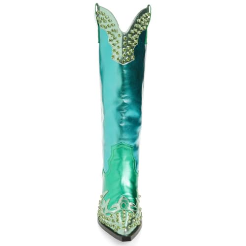 More information about FSJ Women Cowboy Boots Almond Toe Low Heel Pull On Westerm Fashion Colorful Metallic Cowgirl Knee High Boots Stretch Ladies Shoes Size 4-16 US