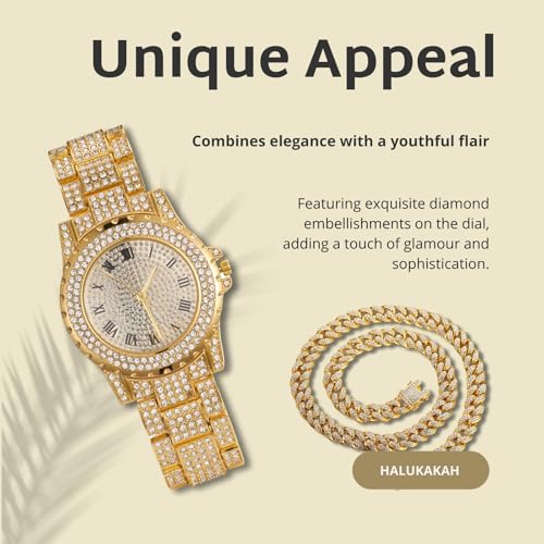 Halukakah Diamonds Gold Watch Iced Out for Boy Teens Kids - 18K Real Gold/Platinum Plated, 39mm Round Dial, Japanese Quartz - 7.5" Length - Optional with Cuban Link Chain - for Birthday, Parties