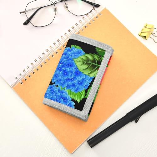 sizzling ! Hibiscus Hydrangeas Black Kids Wallet for Boys Girls Trifold Outdoor Sport Wallets for Youth Teen Child Wallet with Zippered Coin Pockets Card Holders Novelty Wallets with Magic Sticker