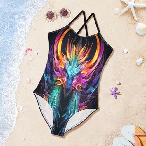 sizzling ! Girl's One Piece Swimsuit Colorful Dragon with Flame Wings Beach Bathing Swimwear