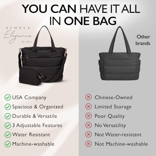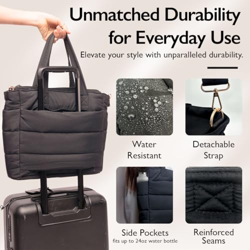Black Quilted Puffer Tote Bag for Women Work Travel Gym - Puffer Crossbody Bag Waterproof Carry every smooth Puffy Tote with Zipper, Pockets, Laptop Slot, Luggage Sleeve β Puffer Purse USA Brand