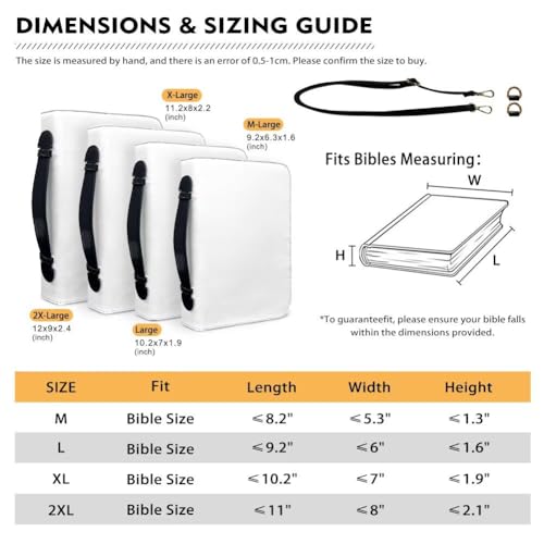 【Material】Our Strap Bible bag is made of Sturdy PU leather material, which is lightweight and comfortable, wear-resistant and waterproof.It is equipped with reinforced handles, straps and metal zipper, which can effectively protect the Bible and other books.【Size Details】This bible cover can fits most Bibles. And have 4 sizes for you to choose from: M: 6.3*9.2*1.6 inches, L: 7*10.2*1.8 inches, XL: 8*11.2*2.2 inches, 2XL: 9*12*2.4. Please carefully measure the size of your bible or book and read the product details before ordering.【Versatile Tote Styles】Womens bible bag with smoothly straps can be used as the bible tote bag as fashion handbag, bible covers, work bag, teacher bag or shopping bag, and we can accept personalized customization and design according to your preferences to create your own rare Bible bag.【Large Capacity】The Bible case can not only stores your Bible, prayer journal, and church bulletin, but also has slots and pockets for storing highlighters, prayer cards, bookmarks, cell phones, tablets or wallets. The bag also spreads out completely when reading your Bible, making it easy for you to read without having to remove the books, which is convenient and hassle-free.【Ideal Choice】The cover design of this PU Bible bag comes in a variety of bright colors and eye catching print patterns for you to choose from. It is a great birthday or Thanksgiving or Christmas choice for your mother, lover and friends. Not only is it a Bible bag, it’s also a handbag and can be worn cross-body. Perfect for everyday use. premium materials and excellent craftsmanship ensure long-lasting durability.