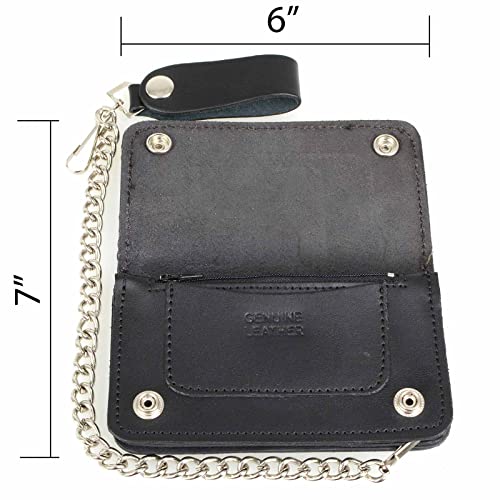 • ✅ Biker Wallet with Removable Chain: Our Black wallet for men with chain is made from heavy duty, 100% full-grain cow leather & and is built to last and designed with removable chain! This trucker wallet has a 14” long stainless-steel chain and key holder that securely clips into your belt loop & has Buffalo Nickel Snaps closures for added security.