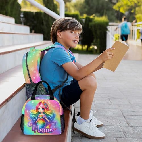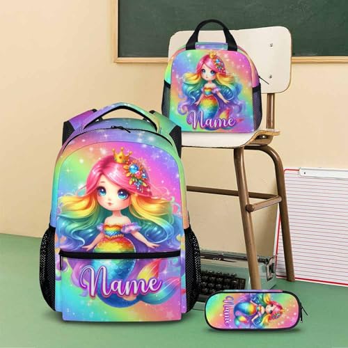 • Custom Design: Our talented designer has created eye-catching mermaid patterns, adding a one-of-a-kind addition to your backpack. Looking for a personalized present? Customize your backpack with your name or text, making it a thoughtful present for yourself or someone special. Kids backpack and lunch box, pencil case entire can customize a name/text, we will make a personalized name schoolbag for you