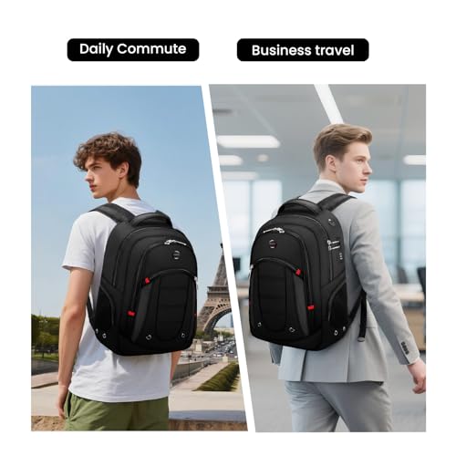 【Large Capacity Multiple Pockets and Organized】-Men travel daily backpack design with more than 10 independent pockets for large storage and organization for small items. 3 spacious main multi compartments with many hidden pockets can accommodate lots of stuffs like travel accessories, clothes, notebook, pen pockets and key fob hook, 2 side pockets with zippers holds a water bottle and umbrella pretty well make your items organized and easier to find. Ideal laptop backpack for men and women.【Durable Material】- This office laptop bag the outer dimensions are 19.7 x 12.6 x 6.7 inch; Capacity: 50L and made up of waterproof 300D outer nylon and a protected soft cushioned inside give exceptional sturdiness longevity and easy to clean. The tough materials will withstand ripping and abrasion, zipper made of metal material is strong and smooth, durable zippers close and open smoothly, ensure a long-lasting usage everyday. Note: Bookbag is waterproof but not for a long time in the rain!【snug Backpack】- Carry-on flight daily backpack with back U shaped three dimensional ventilation design, comfortable wide breathable mesh shoulder straps with plentiful sponge pad help relieve the stress from your shoulder. Served as durable large laptop bag or spacious business backpack, throw under your seat on an airplane when you are traveling or on business trip, you can use it at anywhere for International travel, camping, hiking, trip and work as a good gift choice for men/ women.【Multifunctional & Practical Backpack】- Men business backpacks shoulder straps have an external USB charging port and set-in charging cable that can be easily connected. Shoulder strap with lanyard and card pocket design, can hang sunglasses, public transportation card and other small pendants. The backpack has a headphone hole on the side of the bag perfect for listening to your favorite music at the airport, on the subway, hiking, sports cycling trips. It is a Ideal gifts for men women.【Luggage Strap & Hidden Pockets】- This travel laptop backpacks featuring the luggage belt on the back, business traveller could fit carry on backpack right on the luggage suitcase for easier carrying which frees your hands. A hidden anti theft pocket on the back protect your wallet, passport and valuable items from thieves. This work travel bag is a must-have for business traveling. If you have any issues with this book bag please contact us, we will reply with you within 12 hrs. Perfect for everyday use. top-grade materials and excellent craftsmanship ensure long-lasting durability.