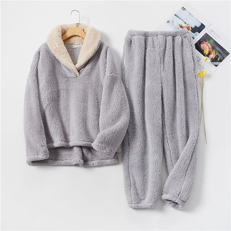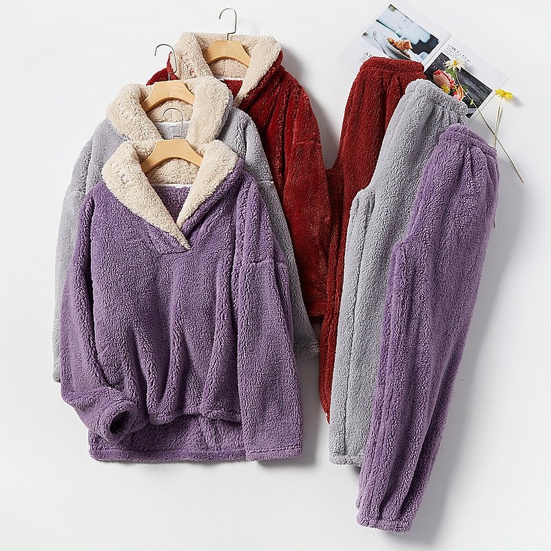 Highlights [Fabric] Crafted from ultra-soft, high-quality fleece material, this women's pajama set offers ultimate warmth and comfort. The plush fabric ensures a cozy feel, especially suitable for the colder months of fall and winter. [Fit] Featuring a relaxed, loose-fitting long-sleeve top and long pants, this set is designed to provide ease of movement without sacrificing style. The pants include a comfortable elastic waistband and slightly tapered cuffs for a secure, yet flexible fit. [Design Highlights] The top showcases a high V wire neckline with contrasting sherpa lining, adding an extra layer of softness and style. The pajama set is designed with a minimalistic pure color pattern in soothing shades like gray, red, and purple, making it a sleek choice for home and casual wear. [Occasions] Ideal for relaxing at home during vacations, the holiday season, or any casual downtime, this loungewear set embodies both comfort and style. Whether you're celebrating Christmas or just enjoying a quiet evening, this set is perfect for creating a cozy atmosphere. [Size Range] Available in a variety of sizes including M, L, XL, and XXL, this pajama set caters to different body types, ensuring a comfortable fit for adults. Perfect for everyday use. top-grade materials and excellent craftsmanship ensure long-lasting durability.