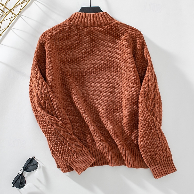 Highlights [Fabric] This elegant sweater is crafted from a soft, cozy knit fabric, offering a micro-elastic fit that ensures comfort and ease of movement during the chilly fall and winter seasons. [Fit] With its regular fit, this sweater is designed to provide a flattering silhouette, accommodating layers underneath while allowing for unrestricted movement. [Design Highlights] The sweater features a mock neck design, providing a chic and sophisticated look suitable for both casual and semi-formal settings. Intricate cable knit patterns adorn the sleeves and sides, adding a touch of elegance and texture, while the long sleeves are finished with ribbed cuffs to keep out the chill. [Occasions] Perfect for work, daily wear, and various fashion-forward occasions, this sweater seamlessly transitions from the office to weekend gatherings, making it an essential piece in any contemporary wardrobe. [Size] Available in sizes M, L, and XL, this sweater offers a versatile fit for a range of body types, in stylish color options of Beige and Red Brown that pair easily with various outfits and accessories. Perfect for everyday use. first-class materials and excellent craftsmanship ensure long-lasting durability.