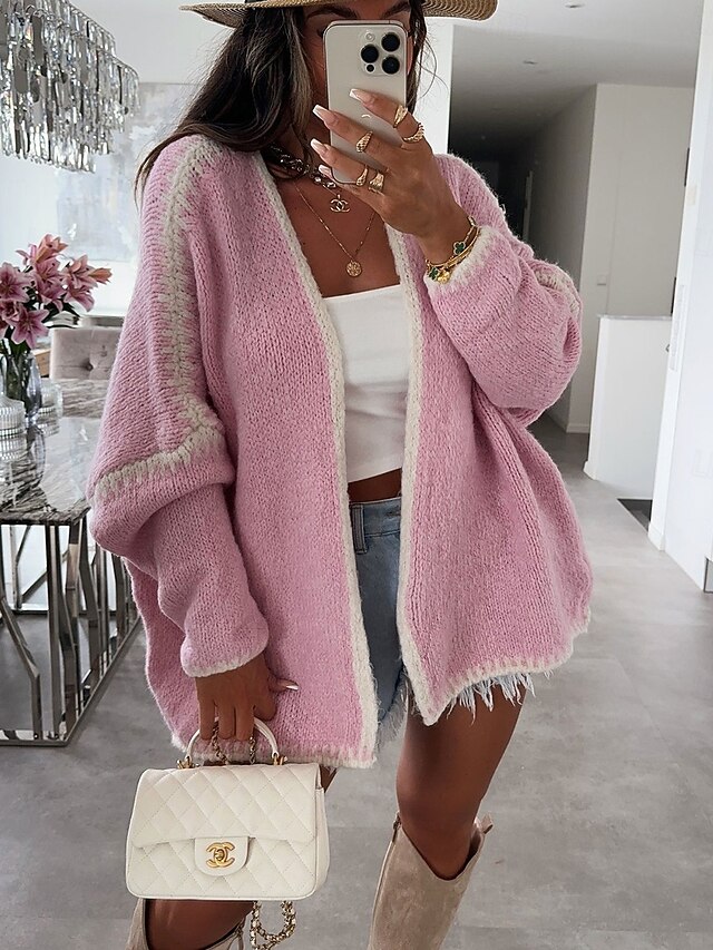 Women's Sweater Cardigan Casual smooth Pure Color Ribbed Open Front Patchwork Knitted Braided Long Sleeve Regular Tops Knit Outdoor Daily Weekend Black Pink Fall Winter