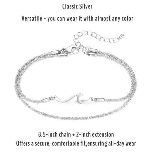 Material: MetalMetal type: Stainless SteelClasp type: Lobster ClawChain type: SolidMetal weight: 8 gGem type: No gemstoneElegant Silver Double Layer Design: Features two elegant silver anklets in one: a unique wave-inspired chain paired with a classic delicate chain, creating stunning ankle bracelets for women that elevate any look with effortless style.Symbol of Strength & Growth: Includes a natural recycled kraft card with the inspiring message: This anklet stands for the highs and lows in life. And like the waves; I will fall, I will rise, and I will persevere. A powerful daily reminder of resilience, self-love, and personal growth.Perfect Gift for Every Connection: Beautifully presented in an elegant SAM & LORI gift box, these waterproof anklets make cherished gifts for bestie, sister, best friend, family member, or yourself β ideal for birthday, summer vacation, beach jewelry, Christmas stocking stuffers, Valentine's, Mother's Day, or Easter basket.Comfortable & Adjustable Fit: Crafted with a delicate 8.5-inch chain+2-inch extension, these versatile stainless steel anklets offer a secure, comfortable fit, ensuring all-day wear.Durable & Waterproof Lifestyle Jewelry: Crafted from premium, tarnish-resistant stainless steel with lustrous finish, these waterproof chains thrive at the beach, pool, or daily life β built to last through every season. Perfect for everyday use. High quality materials and excellent craftsmanship ensure long-lasting durability.