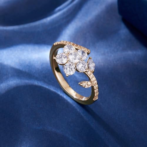 Ring size: AdjustableMaterial: CrystalMetal type: Gold plated copperGem type: Cubic ZirconiaUnique Design: A rotating flower ring with an open statement design, perfect for adding a touch of sparkle and elegance to any outfit.Premium Materials: Dainty Flower Engagement Ring is Crafted from copper and plated with 18k gold for a luxurious finish, featuring sparkling cubic zirconia stones.Versatile Style: This dainty blooming flower spinner ring can be worn as a wrap-around finger ring or a traditional ring, making it a versatile accessory.Adjustable Fit: The open design allows for an adjustable fit, ensuring a comfortable and secure wear on most finger sizes.Ideal Gift: A attractive and thoughtful jewelry gift for any occasion, suitable for women who appreciate delicate and stylish accessories. Perfect for everyday use. first-class materials and excellent craftsmanship ensure long-lasting durability.