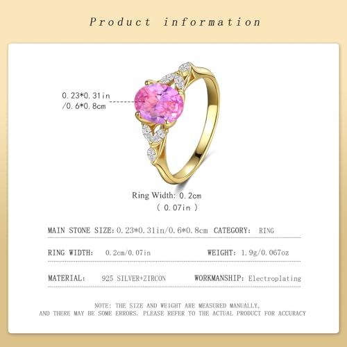 Ring size: 6,7,8Material: Sterling SilverMetal type: Sterling SilverGem type: ZirconPREMIUM MATERIAL: Crafted from genuine 925 Sterling Silver with 18K gold plating, featuring a stunning pink oval-cut zircon centerpiece with clear zircon accentsELEGANT DIMENSIONS: Main stone measures 0.23 x 0.31 inches, with a delicate ring width of 0.07 inches for sophisticated stylingLIGHTWEIGHT DESIGN: Weighing only 1.9 grams (0.067 oz), this ring provides plush all-day wear while maintaining its luxurious appearanceEXPERT CRAFTSMANSHIP: Masterfully created using electroplating technique to achieve a durable and lustrous gold finish over sterling silverVERSATILE STYLING: Available in sizes 6-8, perfect for engagements, weddings, Valentine's Day gifts, or as an elegant everyday accessory Perfect for everyday use. premium materials and excellent craftsmanship ensure long-lasting durability.