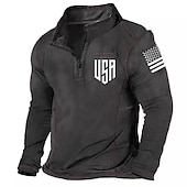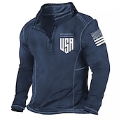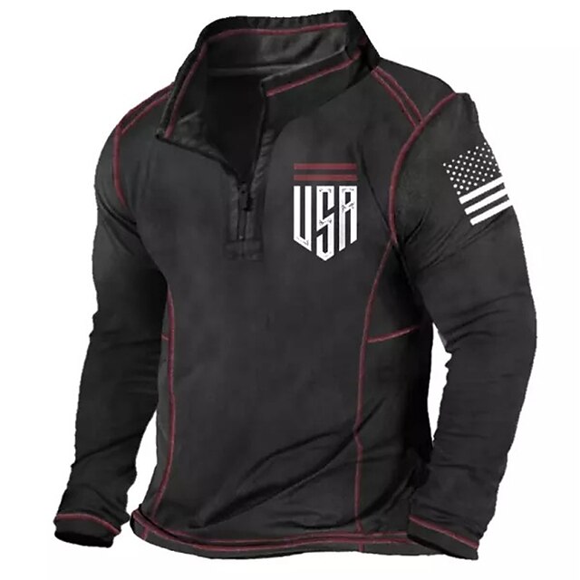 : Featuring a quarter zip for easy layering, this polo shirt includes a distinctive "USA" graphic on the chest and an American flag motif on the arm, offering a bold patriotic touch. The striking red stitching along the long sleeves adds a present-day flair to its traditional silhouette.