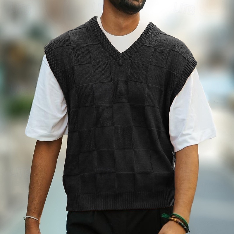 : Featuring a iconic V-neckline and a new-age plain pattern, this vest brings a trendy yet timeless appeal to your wardrobe. The checkered texture adds dimension, and the ribbed hem and neckline provide a polished finish, accommodating a variety of looks.