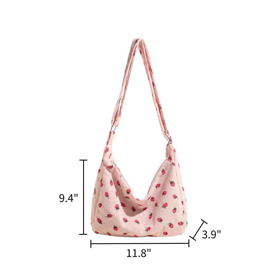 Fabric type: CorduroyOrigin: ImportedClosure type: ZipperLining: Polyester【FASHIONABLE & TRENDY】 The sweet charm of the strawberry prints will add a splash of color to any outfit.【COMPACT AND PRACTICAL】 11.8“ x 3.9” x 9.4”. Spacious enough to hold your daily necessities, such as cell phone, mobile power, water bottle, books, tablets and more. Compact size is easy to carry, suitbale for shopping, party, birthday or a night out.【MATERIAL】 Made of high quanlity corduroy fabric to ensure your bag lasts forever.【MULTIFUNCTIONAL SHOULDER STRAP】 Adjustable crossbody bag is designed to fit all body types and occasions.【GIFT CHOICE】 The cute strawberry shoulder purse is suitable for your daughter, girlfriend, female friends, family members, etc. excellent for everyday use. first-class materials and excellent craftsmanship ensure long-lasting durability.