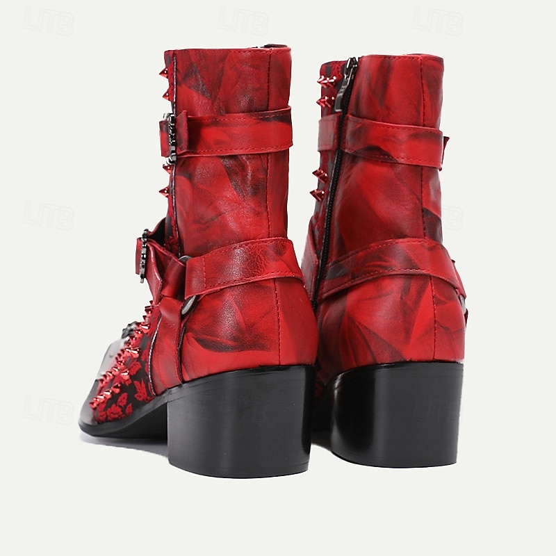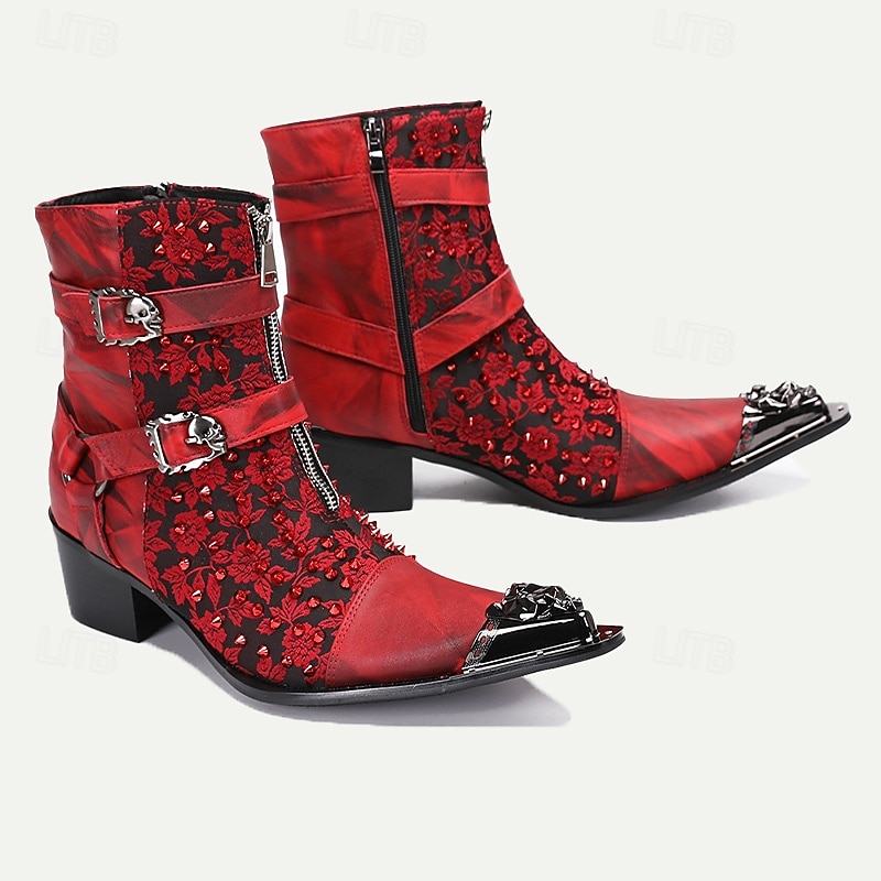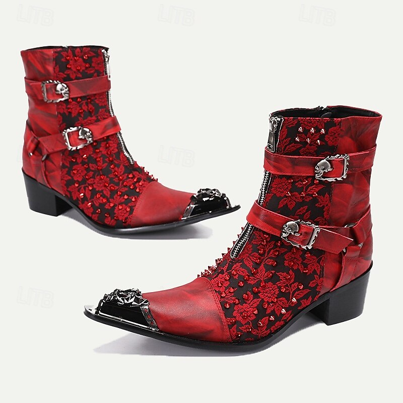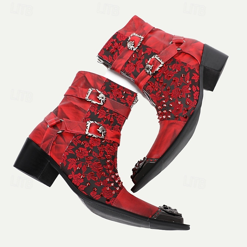 Highlights [Product Fabric] Crafted from 100% premium cowhide leather and jacquard fabric, these Men's Gothic Leather Ankle Boots offer a durable and high-quality finish. The leather lining ensures a comfortable fit, making them ideal for extended wear. [Product Style] These ankle boots boast a bold and captivating aesthetic with a refined pointed toe and sturdy mid-height heel. The combination of red and black leather provides a striking contrast, enhancing the gothic allure of the design. [Design Highlights] Featuring intricate floral embroidery, metal skull buckles, and studded accents, these boots exude a strong punk rock vibe. The metallic toe detail adds a rare edge, while the front zipper and buckle closure allow for easy wearability. The slip-resistant rubber outsole enhances functionality, making these a versatile choice for any wardrobe. [Occasions] Perfect for daily wear, casual gatherings, or adding a statement to your ensemble, these boots seamlessly transition from fall to winter. Ideal for those who embrace bold fashion choices and wish to stand out, they suit a variety of occasions effortlessly. [Size Range] Available in a wide range of sizes, from US6 / EU39 / UK5 to US13 / EU46 / UK12, offering a comfortable fit for various foot sizes. Perfect for everyday use. premium materials and excellent craftsmanship ensure long-lasting durability.
