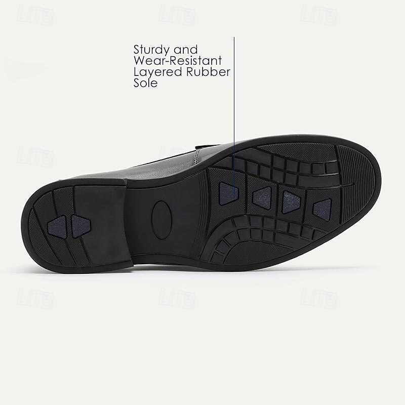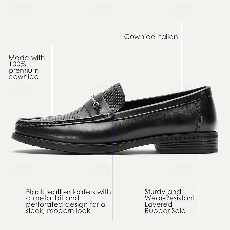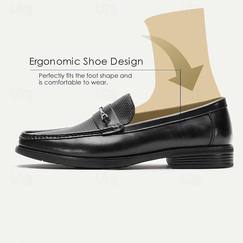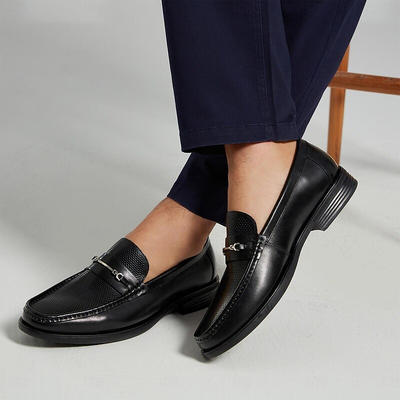 Highlights [Fabric] : Crafted from 100% premium Italian full-grain cowhide leather, these men's loafers exude luxury and durability. The supple leather ensures long-lasting wear while maintaining a sophisticated appearance. The interior is lined with fine leather, offering a soft and comfortable feel against the skin. [Style] : Featuring a classic round-toe silhouette, these loafers embody timeless elegance. The slip-on design combines ease and convenience with a refined, streamlined look, perfect for the discerning gentleman. [Design Highlights] : The upper showcases a perforated texture, adding an element of breathability and subtle sophistication. A sleek metal buckle on the vamp enhances the loaferβs refined appearance, while the braided detail adds a touch of uniqueness and artistry. [Occasions] : Ideal for formal events, office settings, and even casual outings, these loafers transition seamlessly between various settings. Whether at an elegant gathering or a day at the office, they deliver both style and functionality. [Size Notice] : Available in a broad range of sizes from US6 to US13, ensuring a comfortable fit for a wide range of foot sizes. These loafers are designed to meet the needs of the modern gentleman who values both style and comfort. Perfect for everyday use. premium materials and excellent craftsmanship ensure long-lasting durability.