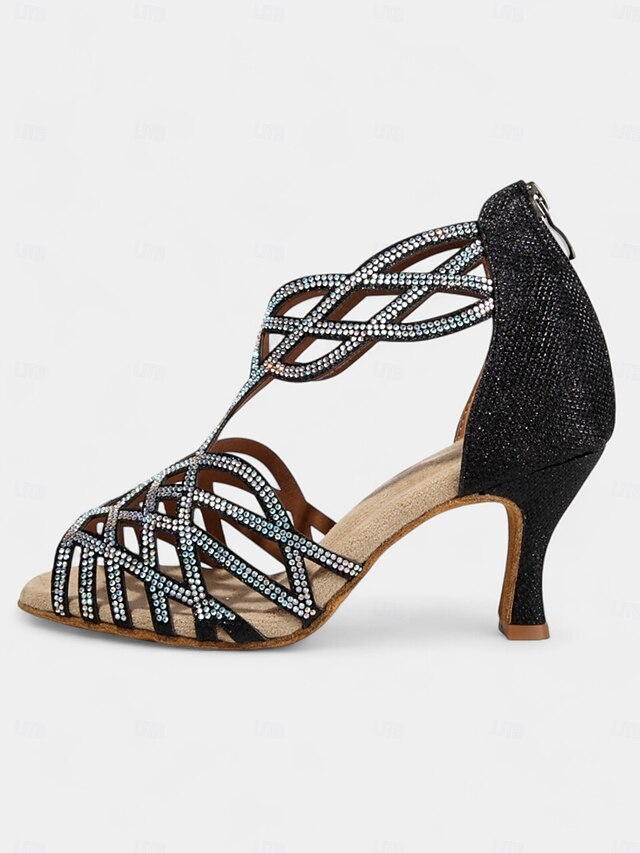Women's Black Rhinestone Dance Sandals with Strappy Design and Mid-Heel – ideal for Ballroom, Salsa, and Latin Dancing