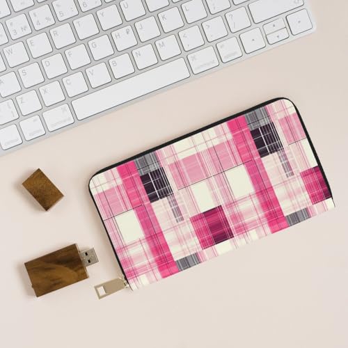 Fashion Pink Plaid Print Wallet Women Men, Long PU Leather Wallets for Women, Cute Womens Travel Wallet Purse Pouch with Zipper Pocket