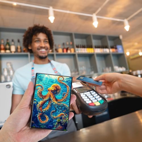 Credit Card Holder Wallet for Women - Ultra-Slim Metal Card Wallet with RFID Blocking | Mini 6-Slot Card Case Wallet, Secure & fashionable Metal Credit Card Holder, Majestic Octopus