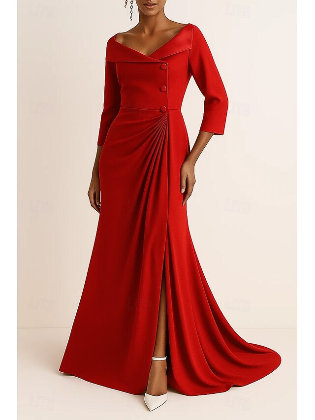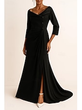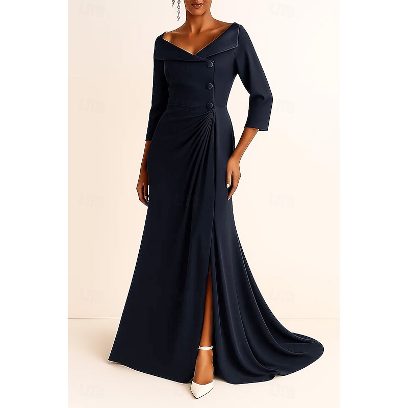 More information about Tuxedo Dress A-Line Formal Wedding Guest Satin Crepe Elegant 3/4 Sleeve Pleated Floor Length V Neck