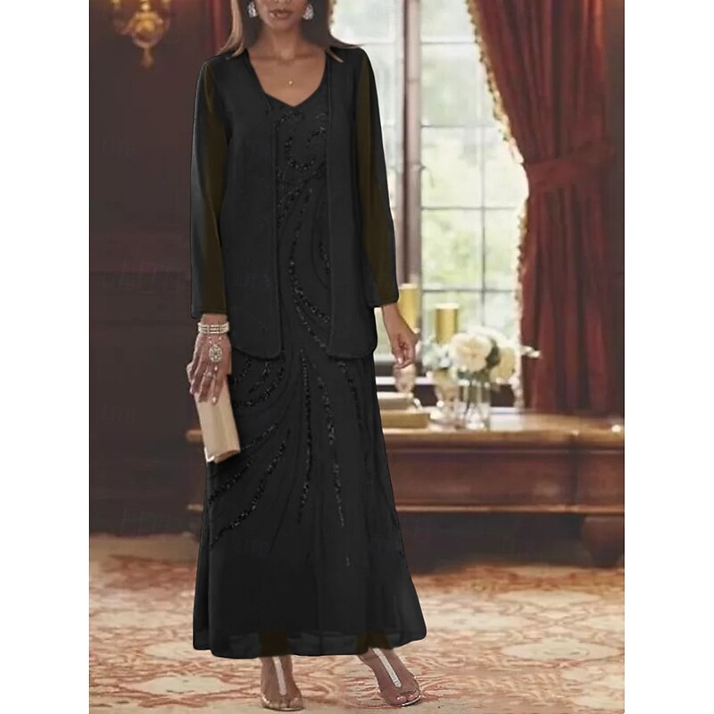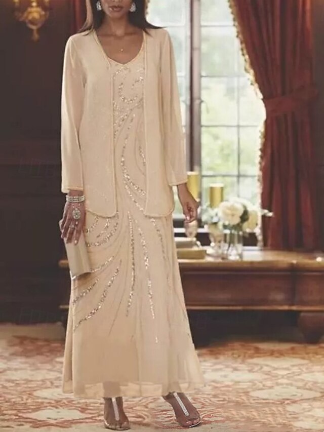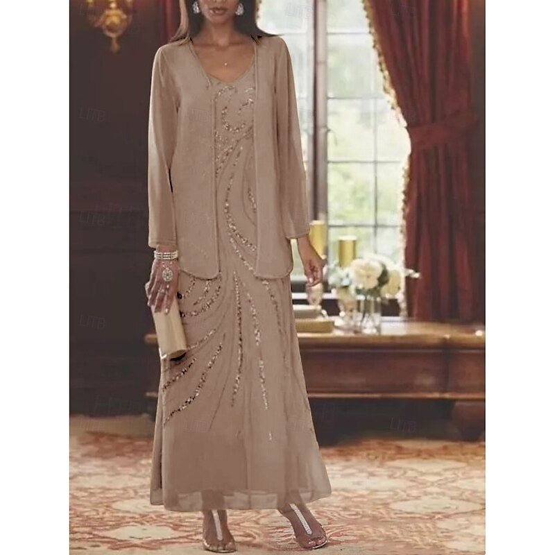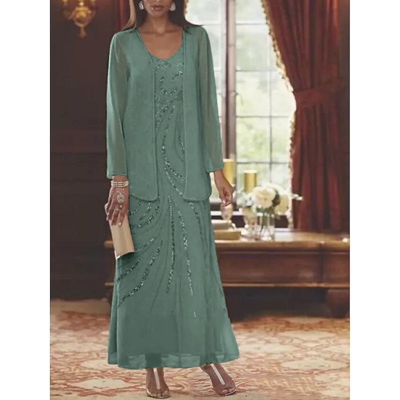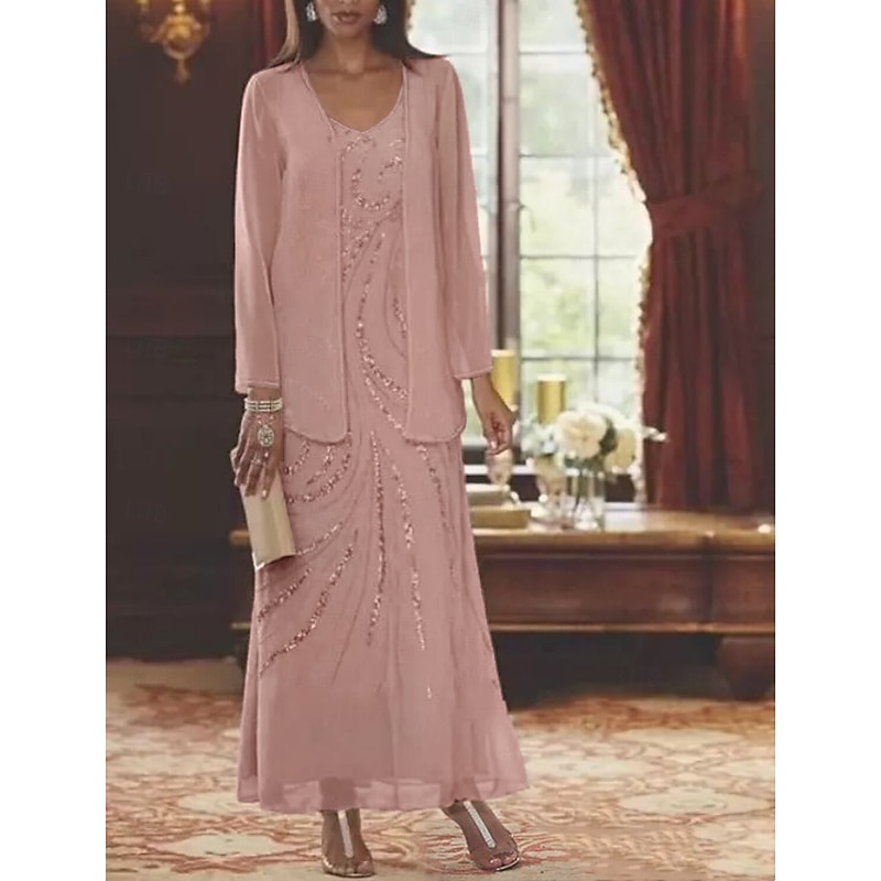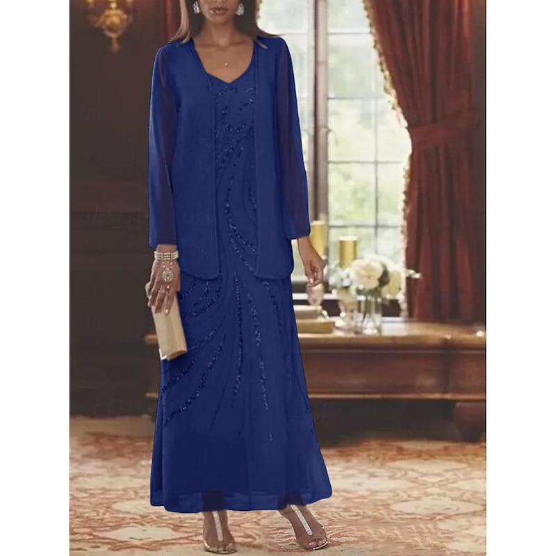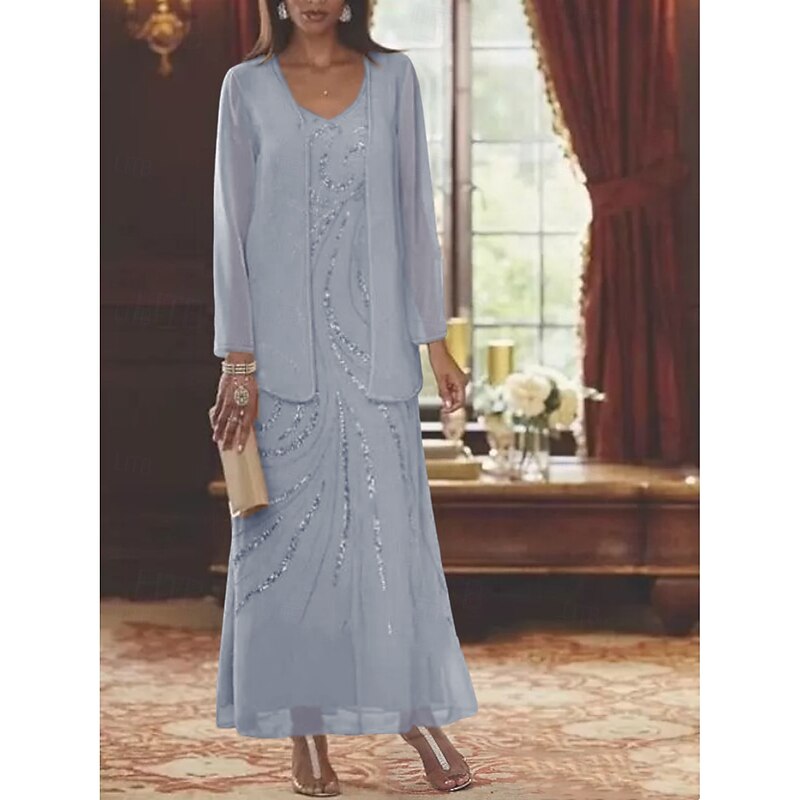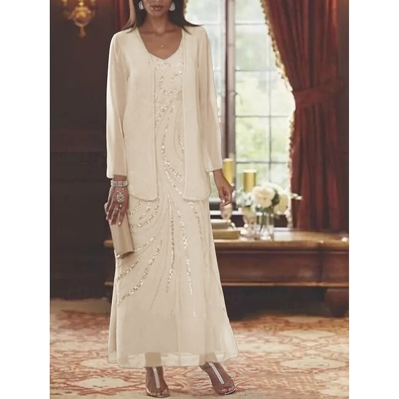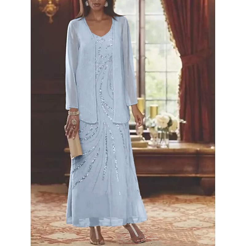 Why Choose Beach Wedding Two Piece Sheath Mother of the Bride Dress Wedding Guest Elegant Sparkle & Shine V Neck Ankle Length Chiffon Sequined Long Sleeve with Sequin?