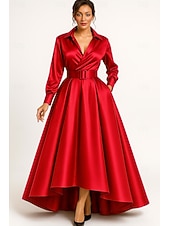 More information about A-Line Mother of the Bride Dress Elegant Vintage Shirt Collar Asymmetrical Floor Length Satin Long Sleeve with Bow(s)