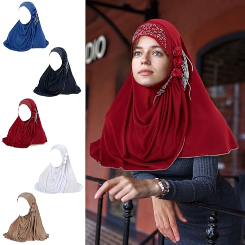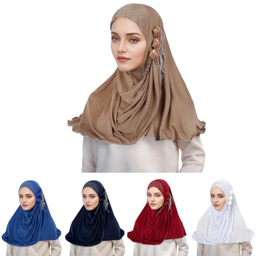 • Women One Piece Muslim Hijab: This one-piece Muslim hijab for women offers full coverage for your head, neck, ears, and shoulders. It features sparkling rhinestone design on the forehead section and 3 flower embellishments with fringes on the left sides, enhancing your elegance and charm.