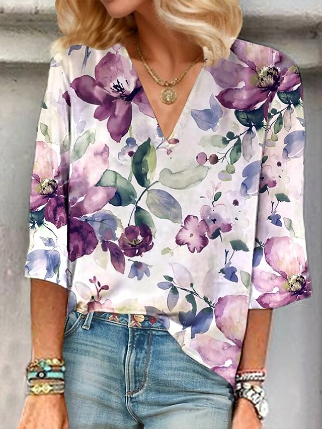 More information about Women's Blouse Button Down Floral Graphic Elegant contemporary Basic 3/4 Length Sleeve V Neck Regular Tops Daily Holiday Going out Print Wine Purple Green Summer Spring