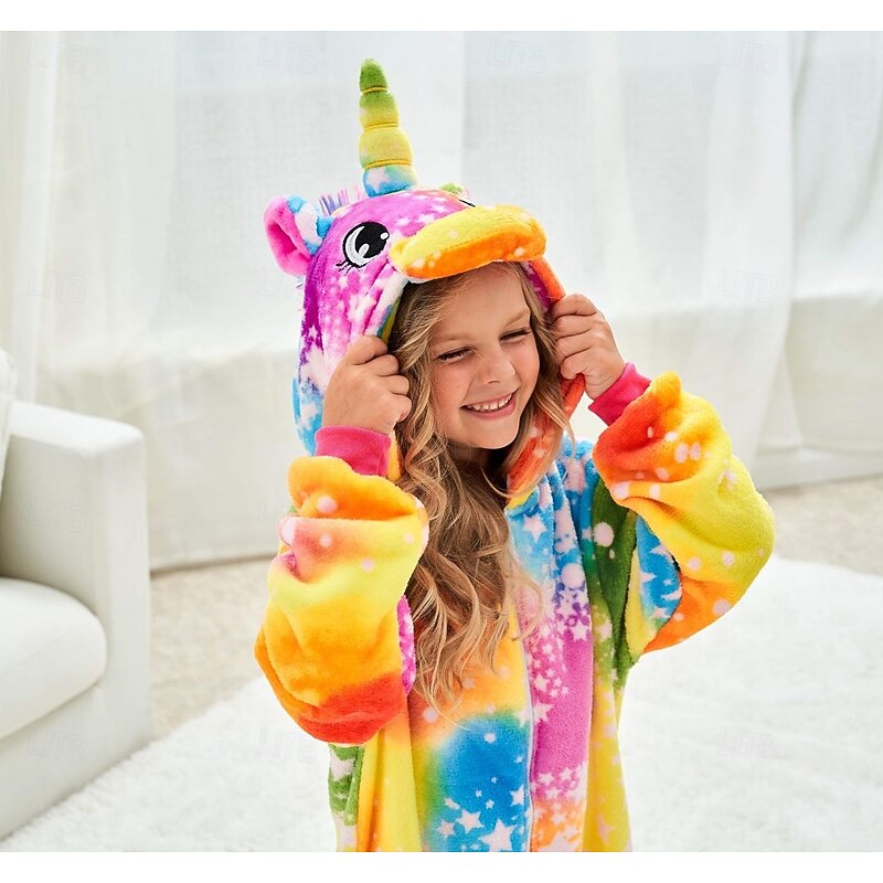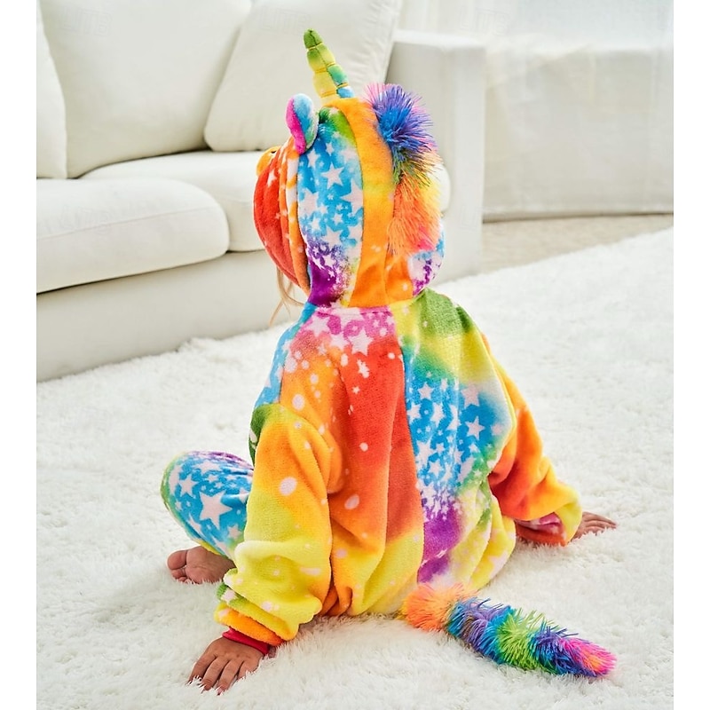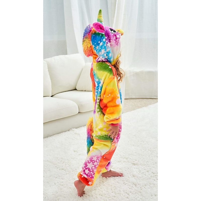Highlights [Fabric] Crafted from high-quality flannel fabric, this onesie provides a plush, warm, and cozy feel, making it perfect for both sleepwear and lounging. Its fleece material is gentle on the skin, ensuring comfort for all-day wear. [Fit] Designed as a loose-fitting, all-in-one piece, the onesie offers ease of movement and all-day comfort. It features a convenient front zipper, allowing for easy dressing and removal, ideal for kids who enjoy freedom and playful activities. [Design Highlights] This vibrant unicorn-themed onesie is adorned with a charming galaxy pattern of rainbows and stars. The hood features delightful unicorn elements, including a horn and ears, adding to its magical and playful aesthetic. The cheerful color palette of pink, blue, and white enhances the whimsy of the design. [Occasions] Perfect for a variety of festive occasions and imaginative play, this onesie is ideal for Christmas, Carnival, Children's Day, and New Year celebrations, as well as casual weekend lounging or imaginative, fun-filled playdates. [Size Notice] Available in a range of sizes to fit kids from approximately 100cm to 140cm, making it suitable for children aged 3-8 years. Perfect for everyday use. premium materials and excellent craftsmanship ensure long-lasting durability.