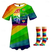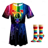 Highlights [Fabric] : Made from a lightweight, breathable polyester and cotton blend, this ensemble ensures comfort and easy movement. The soft and stretchy material of the knee-high socks provides a snug yet plush fit. [Fit] : The dress offers a relaxed fit with short sleeves and a round neckline, making it ideal for casual wear and perfect for versatile layering. [Design Highlights] : Featuring a vibrant rainbow drip pattern with a prominent gender symbol in the center, the dress embodies celebration and inclusivity. The matching knee-high socks boast rainbow stripes for a cohesive look. [Occasions] : Ideal for Pride Parades, Pride Month events, and Carnivals. Whether you're attending a party or celebrating in a parade, this set makes a vibrant and meaningful fashion statement. [Size Range] : Available in a wide range of sizes from XXS to 4XL, accommodating different body types and ensuring a perfect fit for everyone. Perfect for everyday use. premium materials and excellent craftsmanship ensure long-lasting durability.