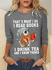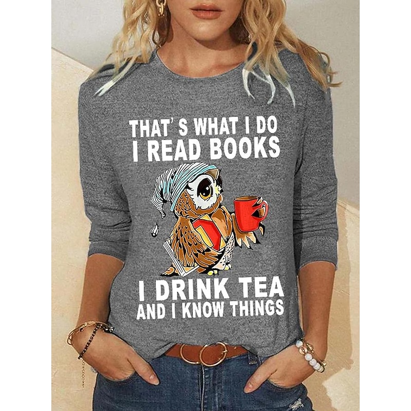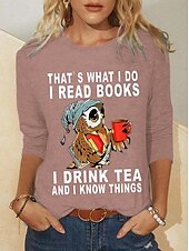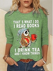 Women's T shirt Long Sleeve Owl Letter Fashion Long Sleeve Round Neck Regular Tops Daily Weekend Print Black Red Blue Green Khaki Spring & Fall Spring, Fall, Winter, Prefall