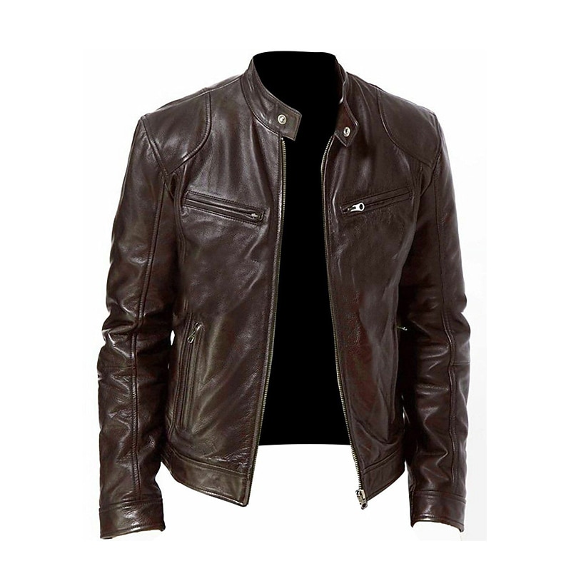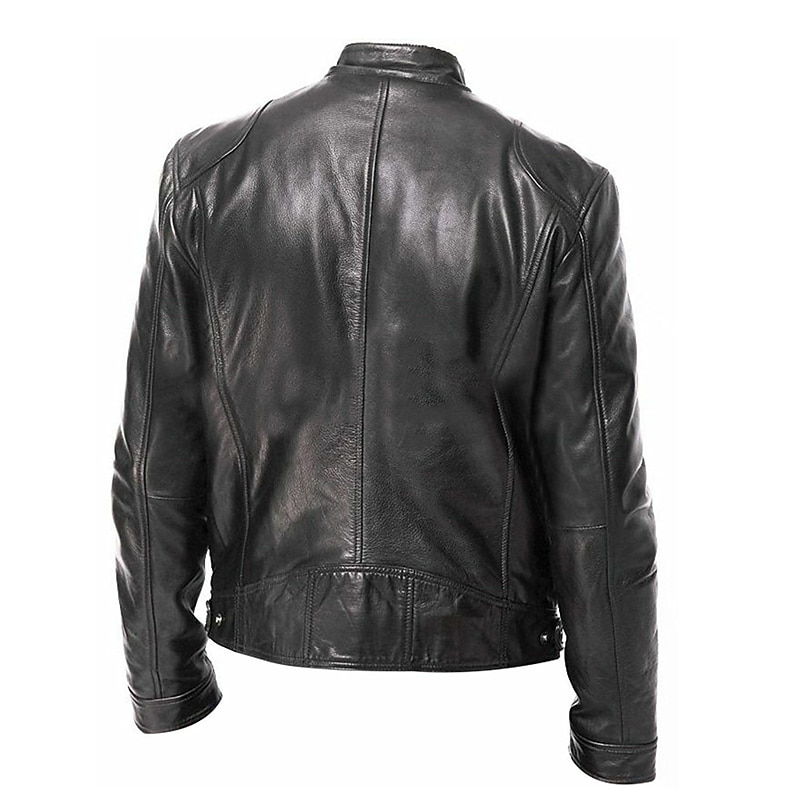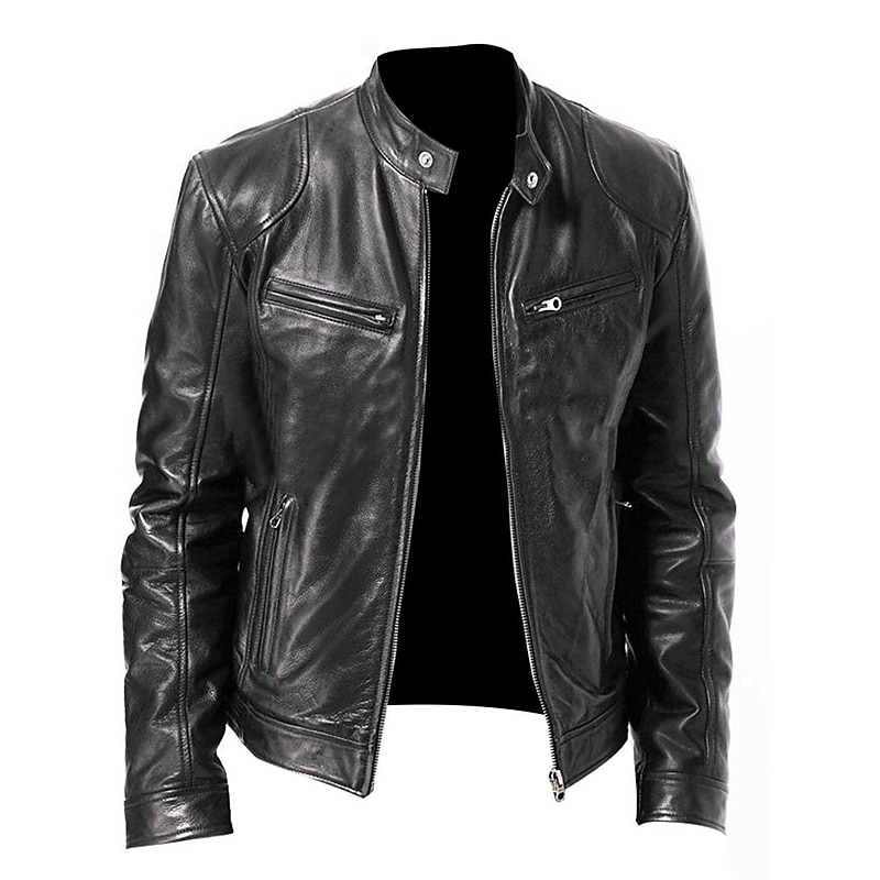 Men's Faux Leather Jacket Transition Jacket Street Windproof Pocket Spring & Fall Streetwear Stand Collar Regular Faux Leather Regular Fit Black Jacket