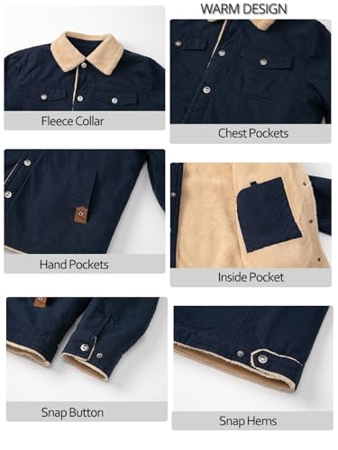 Fabric type: Shell:100%Cotton,Lining:100%PolyesterOrigin: Imported【MATERIAL】The cargo jacket for men made of first-class cotton fabric. Thicken fleece lining bring you comfortable and warm in cold weather. Wind protection and thick enough to keep you warm.【contemporary DESIGN】The sherpa lined jacket with fleece turn-down collar to keep added warmth and stylish. Button front closure, adjustable snap-adjustable cuffs and bottom are providing a comfortable fit. Classic style can be paired with jeans,sports pants,casual pants and overalls.【WARM FUNCTION】The fleece collar is comfortable as well as warm to against the skin and keep wind out. The body of thick sherpa lining provide extra warm and protection when you work or casual daily. The Winter trucker Jacket keep you handsome and warm in spring, fall and cold winter.【MULTI POCKETS】Mens winter cotton jacket has a total of 5 pockets, 2 chest flap pokets with snaps, 2 sides hand pockets and 1 internal pocket. Men windproof work jacket with multi pockets convenient to carry keys, phone, wallet& small intems.【OCCASION】Men sherpa jacket great for work, casual daily wear in winter, fall and spring; outdoor, motorcycling, working, traveling, hiking, fishing, cycling, racing, cosplay, daily and outdoor activities. Gentle Machine wash/ Iron on low heat/ Do not dry clean/ Do not bleach/ Do not tumble dry. Perfect for everyday use. High quality materials and excellent craftsmanship ensure long-lasting durability.