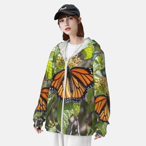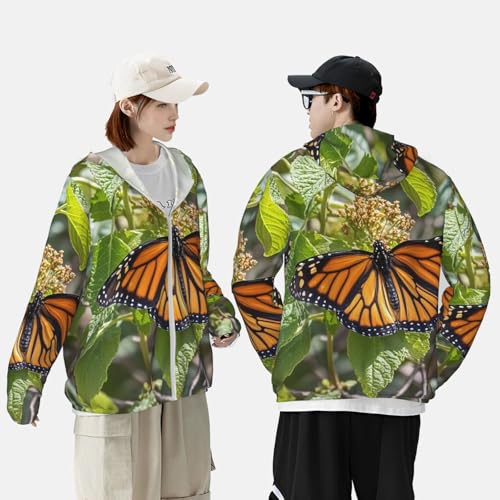 Fabric type: 100% PolyesterClosure type: ZipperNeck style: Hooded NeckFit type: RegularUV Protection UPF 50: Crafted from polyester quick-drying rated fabric block the sun, this UPF 50 sun protection hoodie is lightweight, breathable, and offers a soft touch. It provides wind resistance, UV protection, ensuring durability and long-lasting comfort.Jackets Dimensions: We're confident this long sleeve jacket is some of the best you'll find,there are 6 sizes in total: s, m, l, xl, xxl, 3xl; rich pattern design, covers various themes,comfortable version, follows the fashion trend, making you look more attractive and sophisticated.Unisex Cooling Hoodie Shirts: Our sports jacket zipper and hooded design, easy to wear and take off, fashion goes with everything. Elastic band design at the hem and cuffs, one inner pocket on the left. Hiking sun shirt fits easily in your luggage, backpack or tote bag for on-the-go convenience.Sun Protection: These Monarch butterflies mens long sleeve fishing shirts with a hoodie can protect your neck from sun. UPF 50+ sunscreen fabric, ideal for outdoor activities, such as running, hiking, swimming, fishing and trainingHooded Sun Shirts: Ideal for men and women alike, this Monarch butterflies sport hoodie suits various outdoor activities, comfortable fit, can be paired with a variety of bottoms. A thoughtful gift choice for family, friends, or colleagues who love active lifestyles. Perfect for everyday use. premium materials and excellent craftsmanship ensure long-lasting durability.