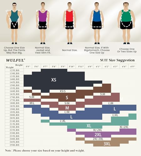 • Package Includes:WULFUL Slim fit 3 pieces suit set includes One button jacket,pant and vest.Available in sizes XS to 3XL,various enduring solid colors for you to choose