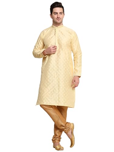 Fabric type: SilkCare instructions: Wash separately in cold water, do not bleach, do not tumble dry, low iron if neededOrigin: ImportedBEAUTIFUL HANDLOOM KURTA PAJAMA SET : This is 3-pieces set that includes long button down shirt or kurta and a drawstring pajama and Scarf. Traditional design on this kurta captures all of the details of the classic Indian men's garment with long sleeves, a long hemline with side vents and a mandarin collarCOMFORTABLE FIT: Sizing is designed for a regular relaxed fit. Kurta's actual garment measurement is 4 inches more i.e. Size Small(38) actual garment measurement will be (42). Available size chest you will get, Small-Medium(38), Medium-Large(40), Large-X-Large(42), X-Large-XX-Large(44). If you prefer regular/ comfort fit go for our exact size. however, if you prefer slim fit, go for 1 size smaller.premium MATERIAL: Lightweight and breathable material gives this kurta pajama set soft, comfortable feel. Made from the finest handloom dupion art silk fabric. The kurta is lightweight with vented side.charming AND HANDMADE: This kurta pajama set is fully handmade by finest artisans of north India.Great Gift Ideas for Men. Please Note :- We strive to make our colors as accurate as possible; however, due to individual monitor settings, we cannot guarantee that the color you see on your screen is the exact color of the product. Perfect for everyday use. High quality materials and excellent craftsmanship ensure long-lasting durability.