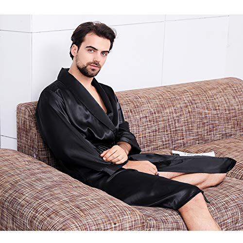 Men's Summer Luxurious Kimono Robe gentle Satin Bathrobe Long-Sleeve Nightgown Printed Pajamas Black, Large/X-Large