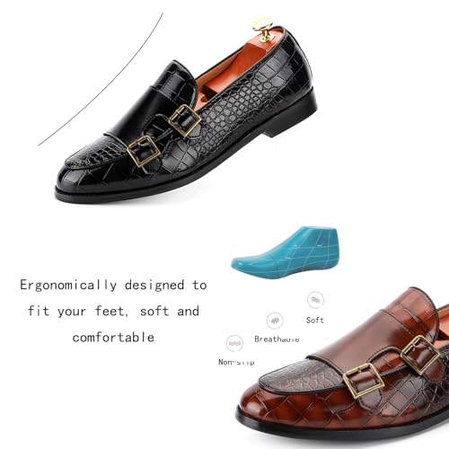 Sole material: RubberOuter material: Faux LeatherClosure type: Pull-OnComfortable Material: Men leather double monk strap dress shoes are made of breathable patent leather, which allows your feet to breathe and feel comfortable, and you won't feel stuffy when walking. Soft and durable, ensuring the flexibility you expect from fashionable, casual, and everyday shoesFashionable Design: Men dress loafers oxfords are made of enduring crocodile-patent leather, with double monk strap design, which can be easily matched with your outfit. The retro style is timeless fashion and can be perfectly matched with jackets, parkas or other suits in almost any occasion, whether formal or casual.Non-slip and Wear-resistant: The sole provides long-lasting durability and helps to maintain a steady pace in various conditions. It has good shock absorption, is flexible, not easy to wrinkle, and is very light and soft. The grooves on the bottom increase the grip and ensure maximum comfort of these men's slip on loafers.Easy to Wear: Men formal business casual penny loafers are lightweight, soft, flexible, anti-folding and easy to carry. Men's dress loafers adopt a convenient slip-on structure, which can save you time when you are in a hurry and save you the trouble of loose shoelaces.Applicable Occasions: Whether it is business or casual wear, it can make you the focus of attention. Gentleman's taste, elegant and casual lifestyle make you stand out, amazing shoes are suitable for weddings, parties, dances, etc. Perfect for everyday use. finest materials and excellent craftsmanship ensure long-lasting durability.