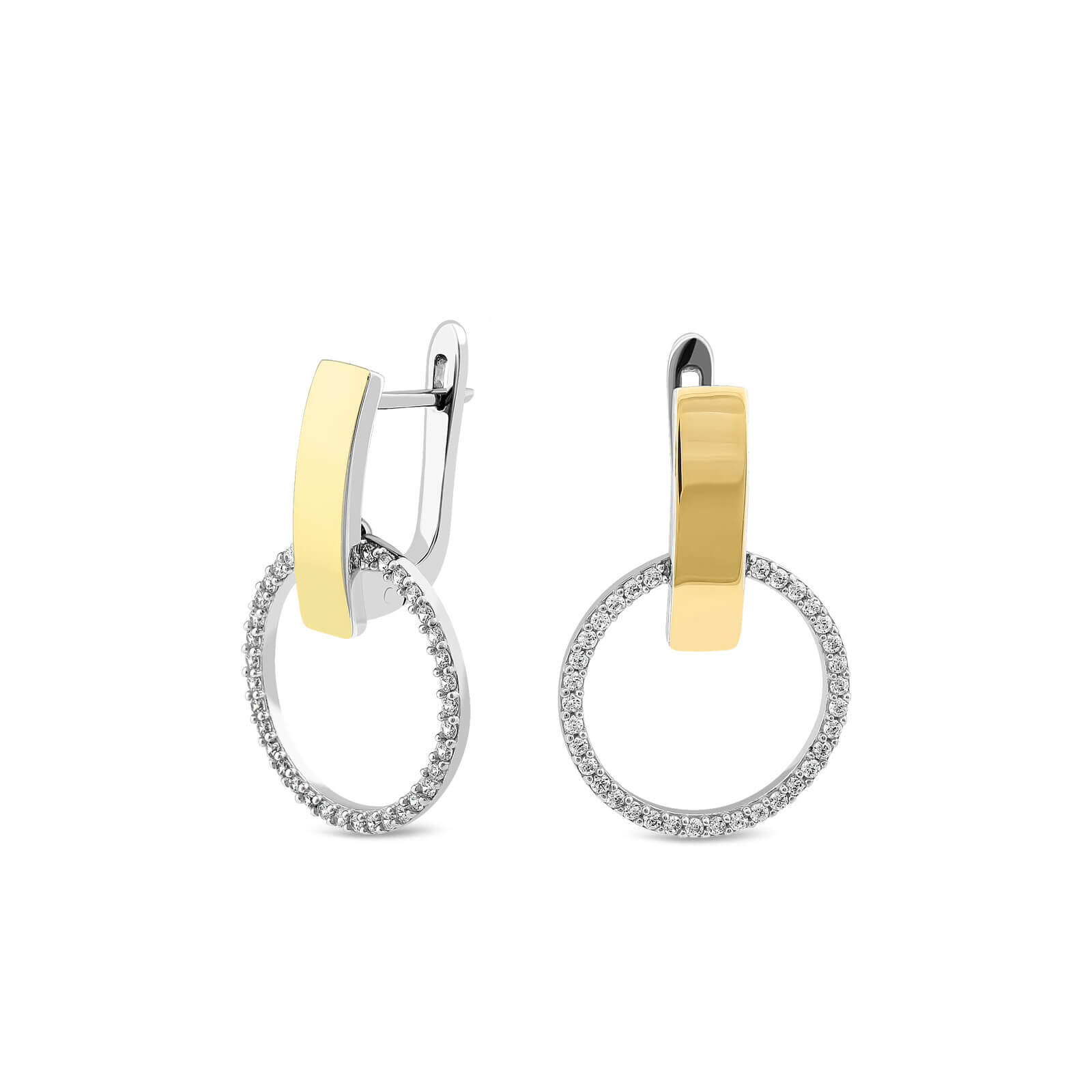 Nowoczesne kolczyki z zapięciem typu angielskiego, które łączą ze sobą srebro w próbie 0,925 ze złotem próby 0,375. Złota i srebrna biżuteria wspaniale prezentuje się razem, takie łączenie staje się teraz bardzo modne. Kolczyki składają się z pionowego elementu, który z przodu został pokryty złotem, oraz koła ozdobionego cyrkoniami. Długość kolczyków wynosi 2,9cm. Połączenie złota i srebra, w ostatnich latach wybiło się na wyżyny modowej odwagi. Ze względu na dwa kolory, kolczyki srebrno-złote stwarzają bardzo dużo możliwości w zakresie doboru innych dodatków, zarówno złotych, jak i srebrnych. Kolczyki ze złota i srebra pozwalają na przełamanie klasycznych stylizacji.